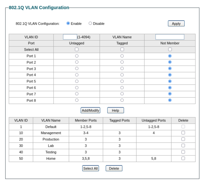 Port 5 and 8 are my WAP and playstation, which connect to my home network with VLAN 50