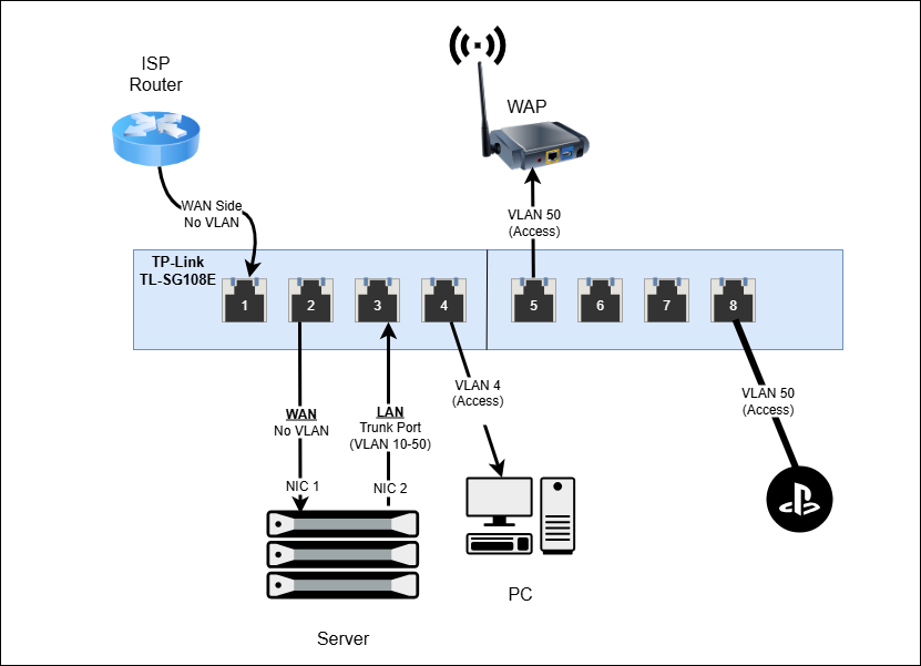 So, in the end, I use my ISP router as main point of contact, but it doesn’t have an SSID and I only use it for IPTV. Then, a cable comes to my VLAN switch from ISP router. Then, there are 2 cables to my HPE server (it has 2 NICs), 1 cable to my WAP, and 1 cable to my Playstation.